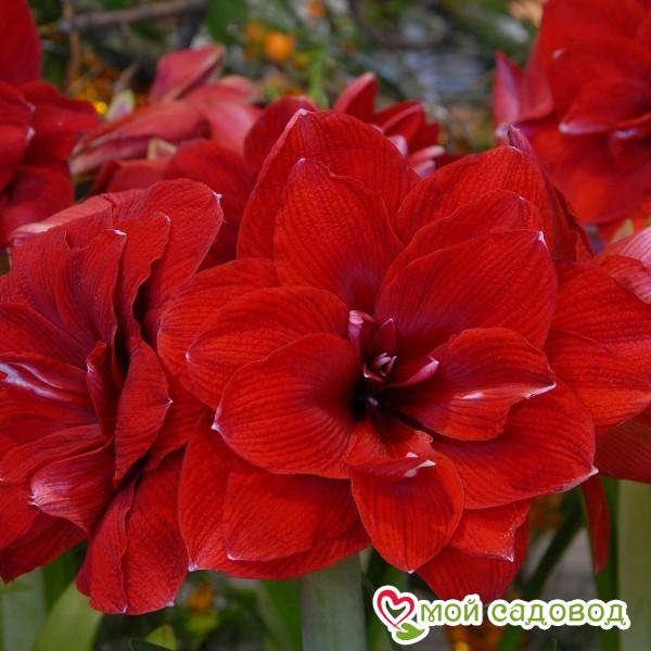 Амариллис (Гиппеаструм) Дабл Драгон – яркий сорт луковичных цветов семейства Амариллисовых. На одном цветоносе распускается до четырёх алых махровых цветков, смотрящих вверх. Диаметр этих броских цветков до 15-20 сантиметров. Высота цветка 60 см.