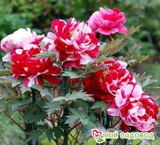 Кустарник высотой 1-1.5 м. Листья крупные ярко-зеленые. Цветет в средние сроки (начало-середина июня). Цветки крупные: 15-17 см, густомахровые, почти шаровидные. На одном растении могут быть совершенно разные по окраске цветки: бледно-розовые с малиновыми вкраплениями, розовые с белым, пурпурные, и другие сочетания этих окрасок. Цветение продолжительное: две недели и более. Лучше растет на солнце, но подойдет и легкая полутень. Розовидная форма. Окраска часто двухцветная: пурпурно-красный с розовым, либо белый с темно-фиолетовым вкраплением. Причем на одном кусте могут встречаться разные цветки. Прямостоячий кустарник с длинным жестким стволом, цветущий в середине сезона. Корень пиона привит на травянистый. Пион древовидный — морозоустойчивый кустарник, достигающий высоты до 2 м, с крупными ярко-зелеными листьями. На одном кусте может быть от 30 до 70 цветков. Диаметр каждого от 20 до 25 см. Продолжительность цветения 12—14 дней. Растение декоративно и после цветения из-за необычной формы листьев. Пион неприхотлив, устойчив к болезням. На одном месте без пересадки может расти более 20 лет. Место посадки Для посадки пионов понадобится защищенное от ветров место с хорошей освещенностью. Сорта светлой окраски, а также пионы с простыми и полумахровыми цветками можно посадить на частично затеняемом участке, это продлит цветение и защитит цветы от выгорания. ХРАНЕНИЕ ДО ПОСАДКИ: После получения посылки, рекомендуем вскрыть пакет и осмотреть корневище. Почки должны быть плотные и розового цвета. Так же уделите внимание самому корневищу, все сомнительные, потемневшие, сморщенные части удалите, а места среза обработайте зеленкой или залой. Если почки еще не тронулись в рост, а высаживать в открытый почву рано, советуем Вам хранить корневище в холодильнике, обязательно оставляя его в пакете с торфяной смесью или в коробке под снегом. Если почки успели раскрыться это не критично, сохранить до посадки их так же возможно, высадите корень пиона в большой просторный горшок или в любую другую ёмкость.