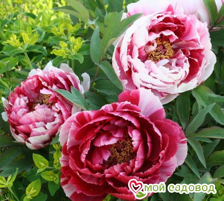 Пион древовидный — морозоустойчивый кустарник, достигающий высоты до 2 м, с крупными ярко-зелеными листьями. На одном кусте может быть от 30 до 70 цветков. Диаметр каждого от 20 до 25 см. Продолжительность цветения 12—14 дней. Растение декоративно и после цветения из-за необычной формы листьев. Пион неприхотлив, устойчив к болезням. На одном месте без пересадки может расти более 20 лет.